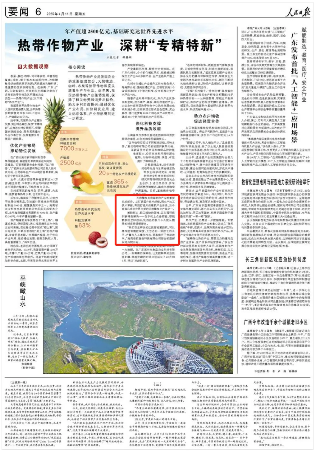4月11日,《人民日报》要闻版刊发《热带作物产业 深耕“专精特新”》,重点提及麻豆tv 的智能割胶机研发成果